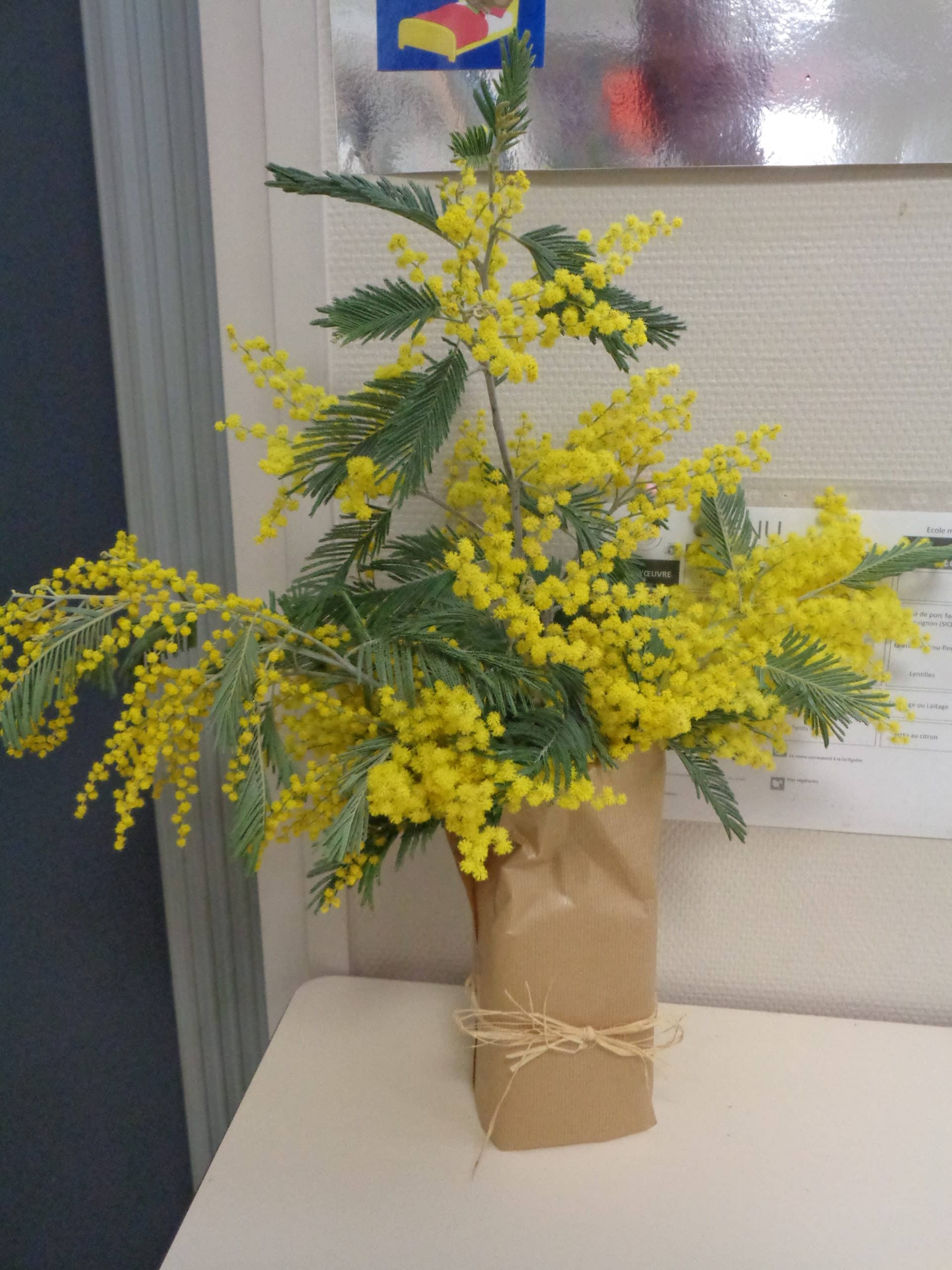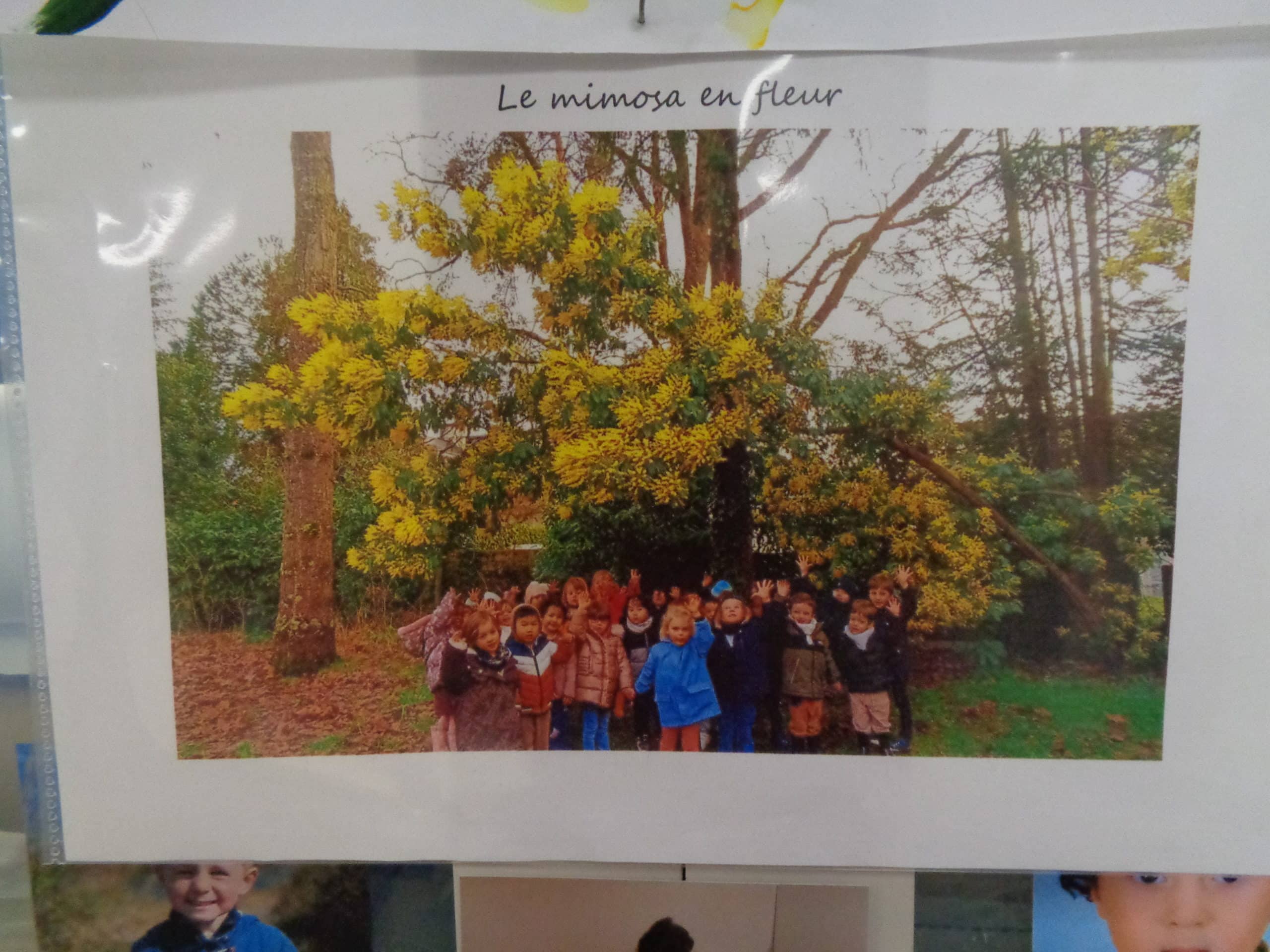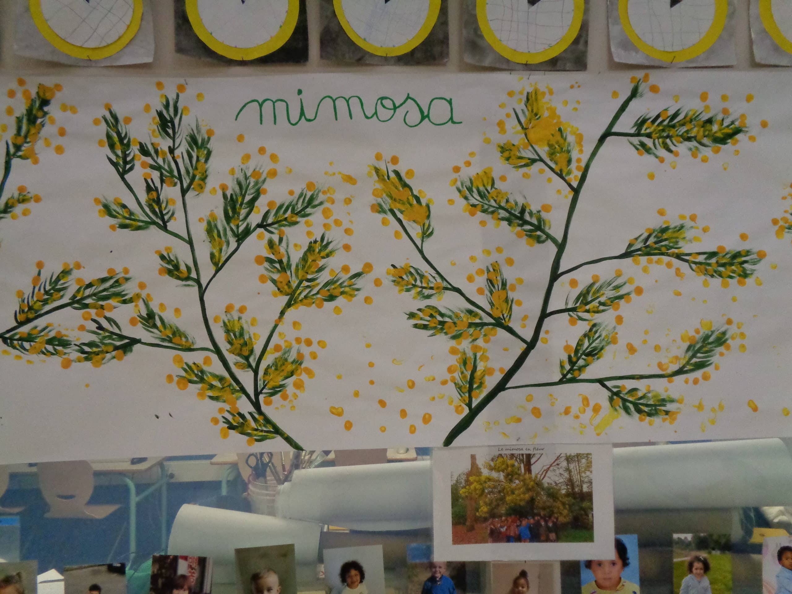 L’hiver, dans le couloir des maternelles poussent des arbres divers. Des sapinières des montagnes peuplées de bonhommes de neige. Des arbres sans feuilles aux branches recouvertes d’un épais manteau de neige que viennent parfois égayer des oiseaux d’écharpes et de bonnets revêtus. Février arrivé, des petites boules jaunes d’or apparaissent dans des bouquets ou sur des fresques. Seul leur manque le parfum enivrant du mimosa.